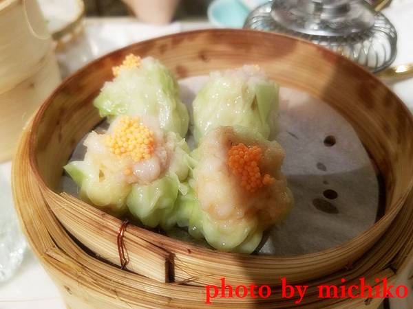 綠色的燒賣皮,包著豬肉及蝦肉餡。